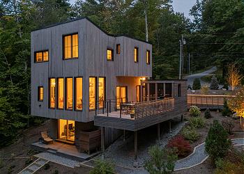 "What a unique and wonderful home to spend our week-long family summer vacation. My husband and I stayed with our 3 kids and had the best time. The house was meticulously maintained and thoughtfully designed. We had many meals on the outdoor patio. The lower level was great for movie night and sleepovers in bunk beds. We loved using the paddle boards and kayak out on the lake too!"
