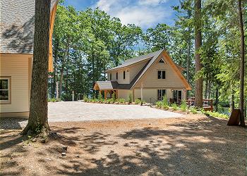 Located on a wooded lot, Wekepeke Estate offers a brand new, hand crafted, two-story Main House equipped with full upscale kitchen, living room (with television and Sono's audio), deck with grill off the living room, and master bedroom suite. The main floor Master bedroom, with king size bed, has a master bath, walk-in closet, television, and French doors leading to a second deck overlooking Lake Winnipesaukee. Upstairs, in the Main House, there are two bedrooms, each with sitting areas, television with Sono's audio, and walk-in closets. A master bath is located between the two-bedrooms on the second floor.